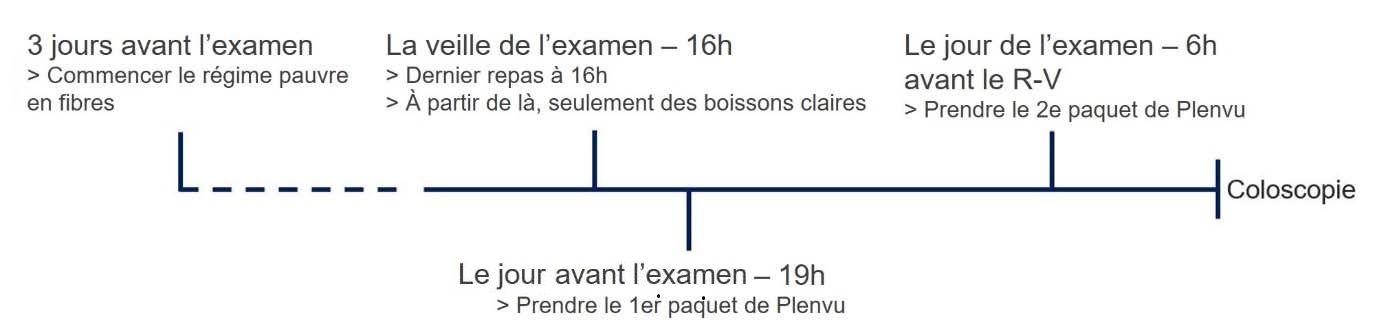 Évitez les aliments avec des pépins comme le raisin, les kiwis et les tomates et suivez un régime pauvre en fibres selon les instructions ci-dessous. Vous avez un doute au sujet d’un aliment ? Évitez dans ce cas de le consommer avant l’examen.