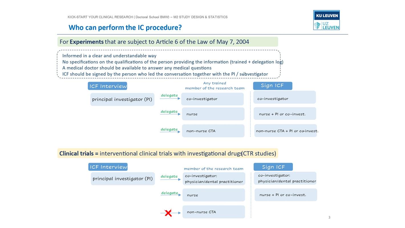 Experimenten vallen onder artikel 6 van de wet van 7 mei 2004 waarin staat dat de patiënt op een duidelijke en begrijpelijke manier moet worden geïnformeerd. Er wordt niet gespecificeerd wat de kwalificaties moeten zijn van de persoon die de informatie verstrekt. Als het toestemmingsproces duidelijk is beschreven (met de bevestiging dat een arts direct beschikbaar is om eventuele medisch gerelateerde vragen te beantwoorden, mocht een dergelijke vraag door de proefpersoon worden gesteld tijdens het toestemmingsproces) en het duidelijk is dat de persoon aan wie het toestemmingsproces is gedelegeerd, goed is opgeleid (en de taak is gedelegeerd in het delegatielogboek), kan de EC toestaan dat het voeren van het geïnformeerde toestemmingsgesprek wordt gedelegeerd aan leden van het studieteam die volgens de wet van 10 mei 2015 geen beroepsbeoefenaar in de gezondheidszorg zijn (bijvoorbeeld een CTA die biomedische wetenschappen heeft gestudeerd). In overeenstemming met artikel 4.8.8 ICH-GCP moet het ICF worden ondertekend door de persoon die het informed consent interview heeft uitgevoerd. Het ICF moet altijd worden ondertekend door de hoofdonderzoeker of superviserende medeonderzoeker.