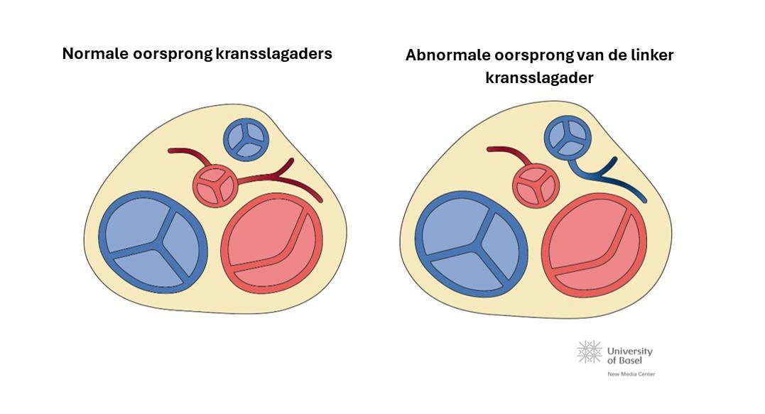 Op de afbeelding wordt een doorsnede van het hart getoond waarbij de kleine rode cirkel de aortaklep voorstelt en de kleine blauwe cirkel de longslagaderklep. Bij de tweede afbeelding ontspringt de linker kransslagader vanuit de longslagaderklep.