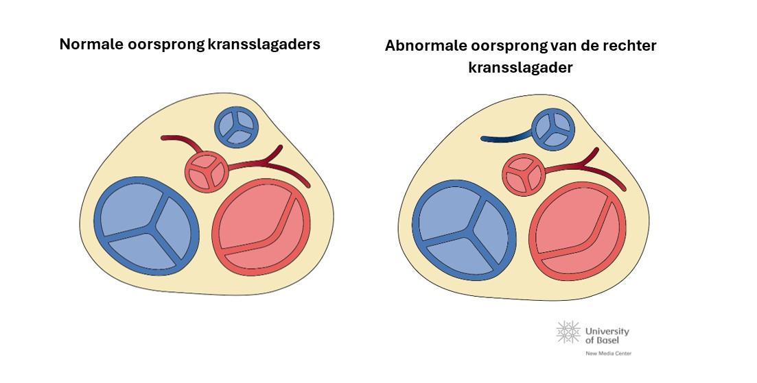 Op de afbeelding wordt een doorsnede van het hart getoond waarbij de kleine rode cirkel de aortaklep voorstelt en de kleine blauwe cirkel de longslagaderklep. Bij de tweede afbeelding ontspringt de rechter kransslagader vanuit de longslagaderklep. Bron: https://www.congenital-heart-disease.ch/heart-disease