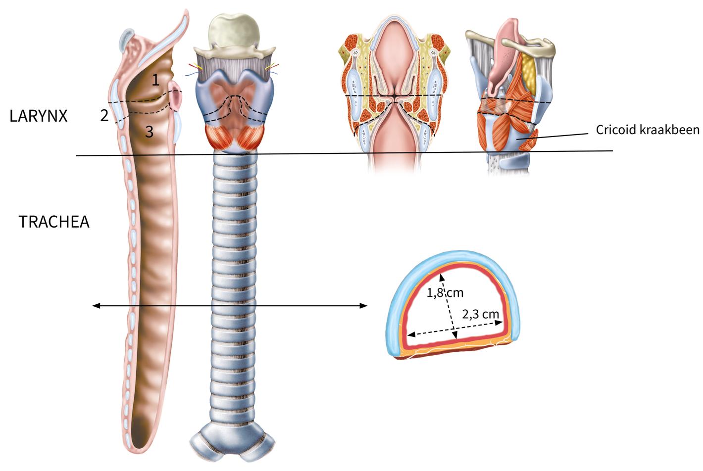 De subglottis larynx is het nauwste deel van de luchtweg, en stenosevorming wordt het meest frequent gezien op dit niveau. Het cricoïd-kraakbeen is het enige volledig circulaire kraakbeen van de luchtweg (Fig. 1.1.1) en houdt de competentie van de laryngeale luchtweg in stand. Het cricoïd-kraakbeen is dan ook een cruciale structuur in elke ablatieve en reconstructieve luchtwegprocedure.