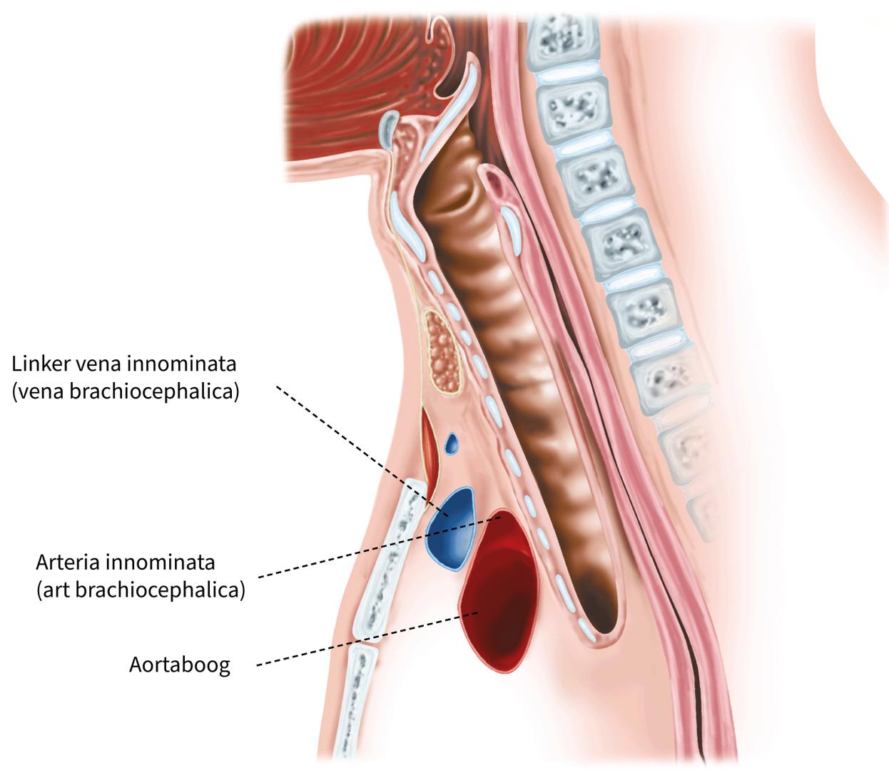 De arteria innominata loopt schuin over de midtrachea vanaf het punt van oorsprong van de aortaboog naar de rechterkant van de hals. Ter hoogte van de carina passeert de linker hoofdbronchus onder de aortaboog, terwijl de rechter hoofdbronchus onder de azygosader ligt. De longslagader ligt net voor de carina. Het verloop van de luchtpijp van een anterieure cervicale positie naar een posterieure mediastinale positie brengt deze in de nabijheid van grote vasculaire structuren. Daardoor is het moeilijk om via een enkele incisie de hele luchtpijp te bereiken (Fig. 1.1.4).