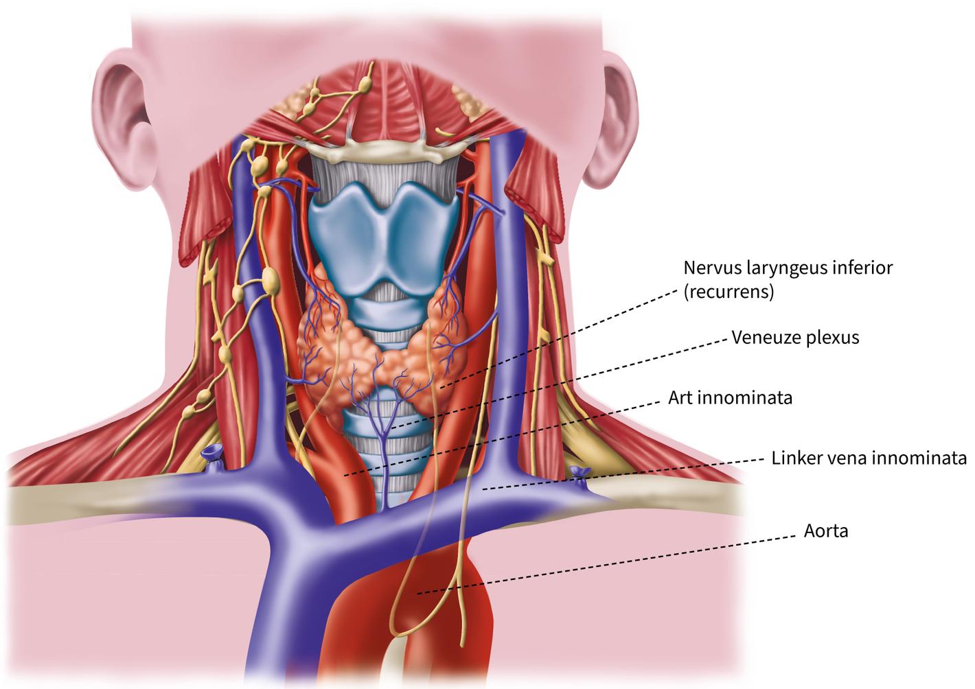 Aan de voorkant bedekt de isthmus van de schildklier de luchtpijp nabij de tweede tracheale ring. In de groeve tussen de luchtpijp en de slokdarm (tracheo-esophagale groeve) bevinden zich de nervi recurrentes (nervus laryngeus inferior, afsplitsend van de nervus vagus) met een verloop onder de boog van de aorta aan de linkerkant. Als gevolg hiervan vertoont de linker nervus laryngeus inferior een langer verloop aan de linkerkant dan aan de rechterkant, waar de zenuw een lus maakt rond de arteria subclavia om vervolgens de groef tussen slokdarm en trachea te bereiken. Deze zenuwen komen de larynx binnen tussen de cricoïd en het thyroid of schildkraakbeen (Fig. 1.1.3). Ze verzorgen de motorische bezenuwing van de intrinsieke larynxspieren.