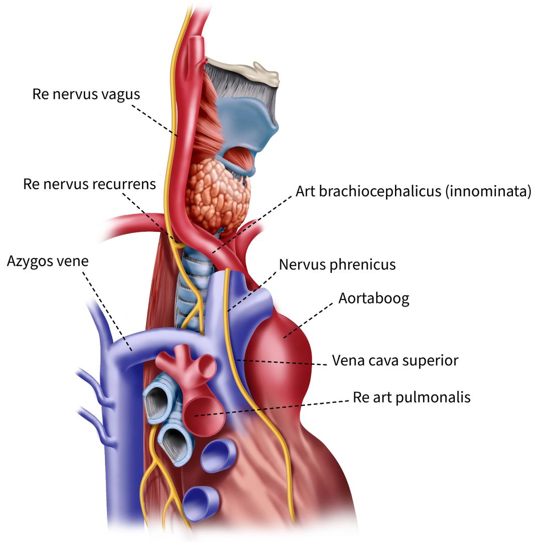 Mediastinale structuren die de trachea omgeven. Noteer het verloop van de nervus vagus en de nervus recurrens links en rechts.