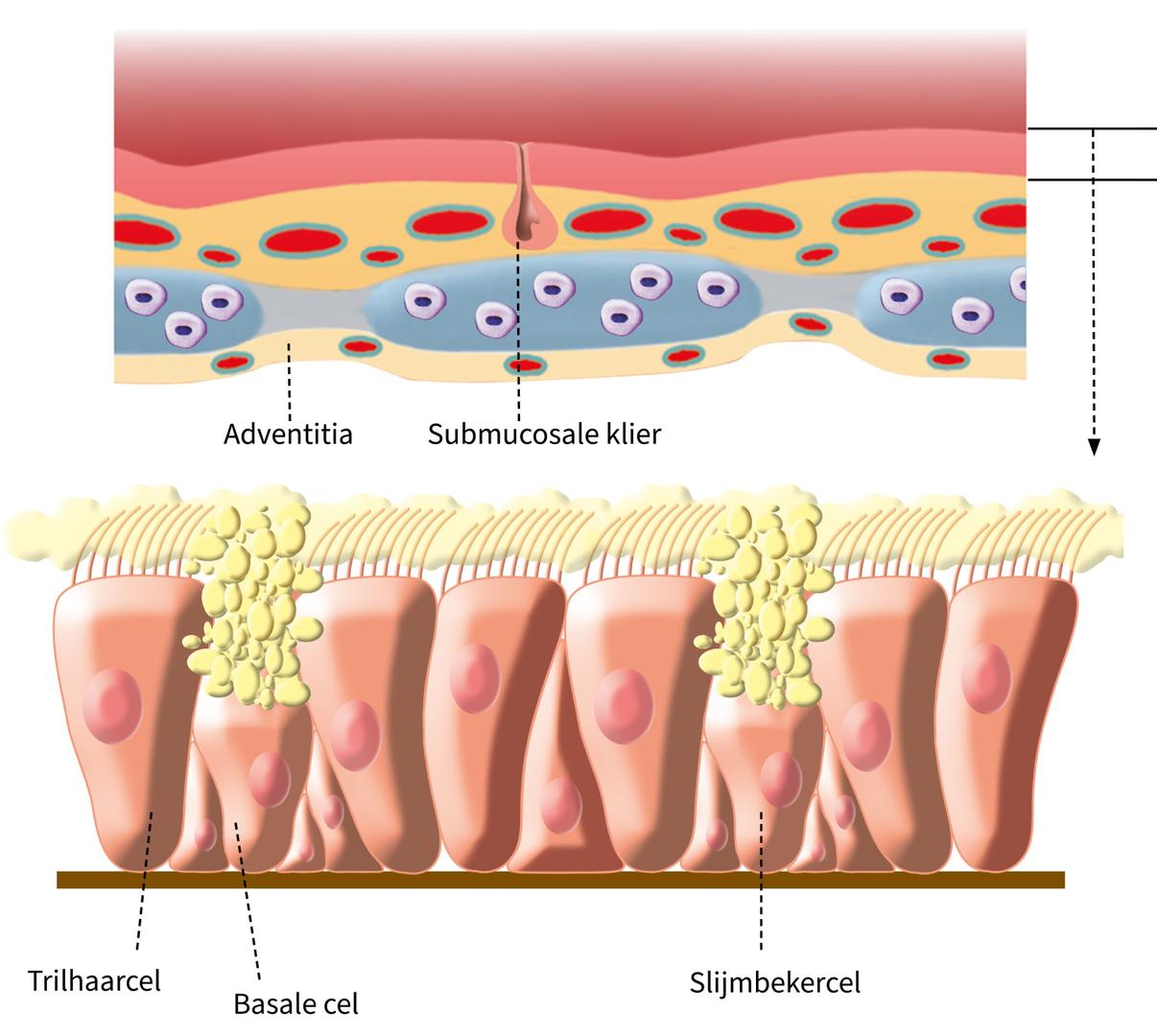 Boven de basale membraan bevindt zich een pseudogestratifieerd epitheel. Het oppervlakkig epitheel is columnair en gecilieerd, terwijl de diepere lagen ovale en ronde basale cellen bevatten. De slijmbekercellen secreteren mucus. Dit slijm smeert het tracheale oppervlak en houdt vreemde deeltjes, zoals stof en bacteriën, vast. De submucosale laag is samengesteld uit een los netwerk van bindweefsel dat bloedvaten, zenuwen en slijmklieren bevat. De kanalen van de submucosale slijmklieren doorboren de bovenliggende lagen en openen aan de oppervlakte. De buitenste tunica, de adventitia, is samengesteld uit los bindweefsel dat kleine bloedvaatjes bevat die de luchtpijp voeden.