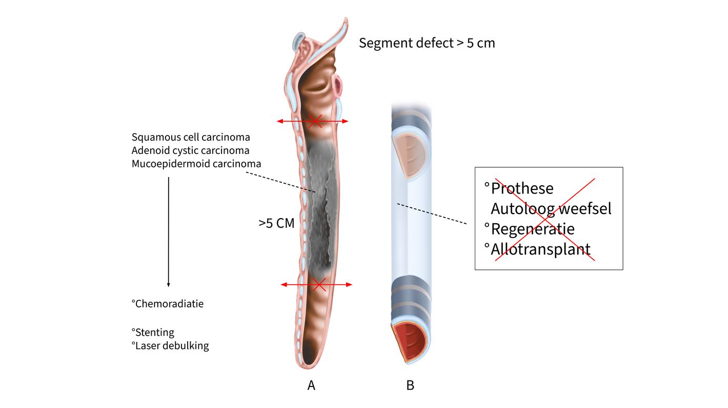 Lange segmentale defecten kunnen het gevolg zijn van de resectie van een kwaadaardige tracheale tumor (A). Het resulterende defect (B) vereist een circumferentiële tracheareconstructie. Omdat er geen veilige en betrouwbare methoden zijn voor een circumferentieel herstel, worden kwaadaardige tumoren (spinocellulair, adenoid cystic, mucoepidermoid carcinoma) van de luchtpijp die zich uitstrekken over een lengte van meer dan 5 cm beter behandeld door chemoradiatie en palliatieve maatregelen zoals stentplaatsing en laser debulking.