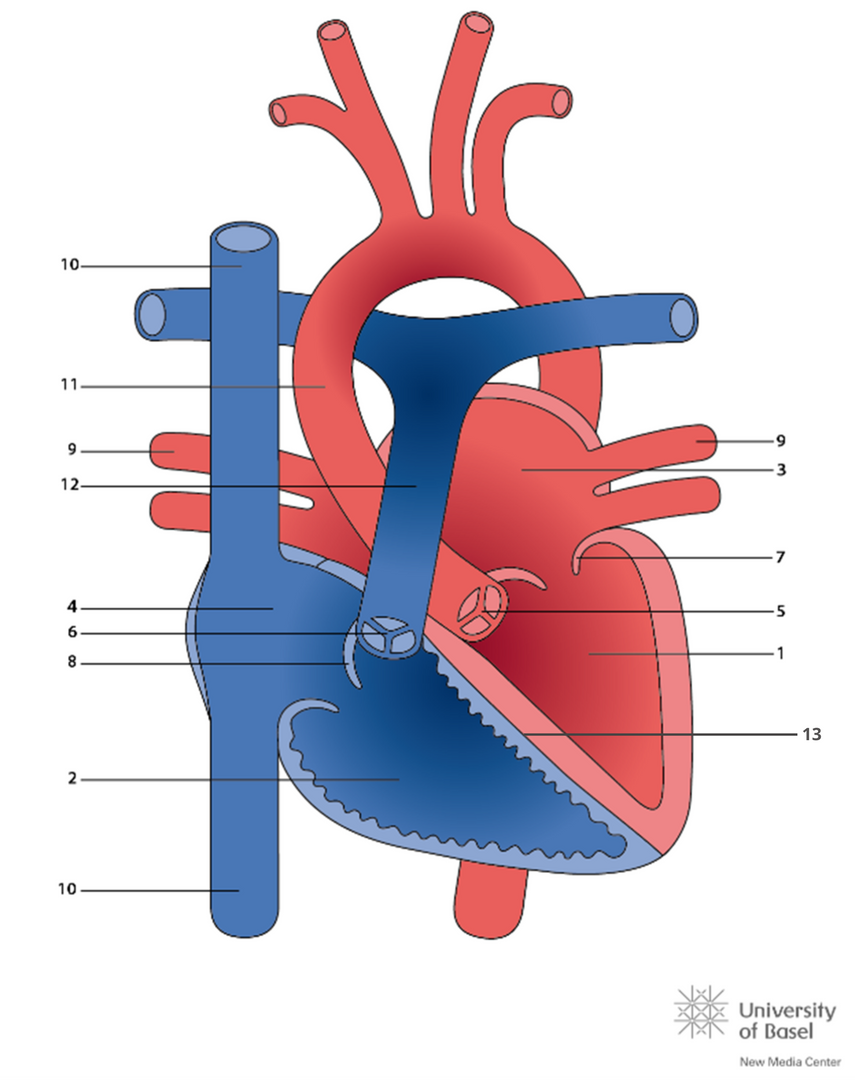 De hartkamers zijn verbonden met grote bloedvaten waarlangs bloed in en uit het hart stroomt. We onderscheiden de longaders (9), de bovenste en onderste holle ader of vena cava superior en vena cava inferior (10), de aorta (11) en de longslagader of arteria pulmonalis (12).