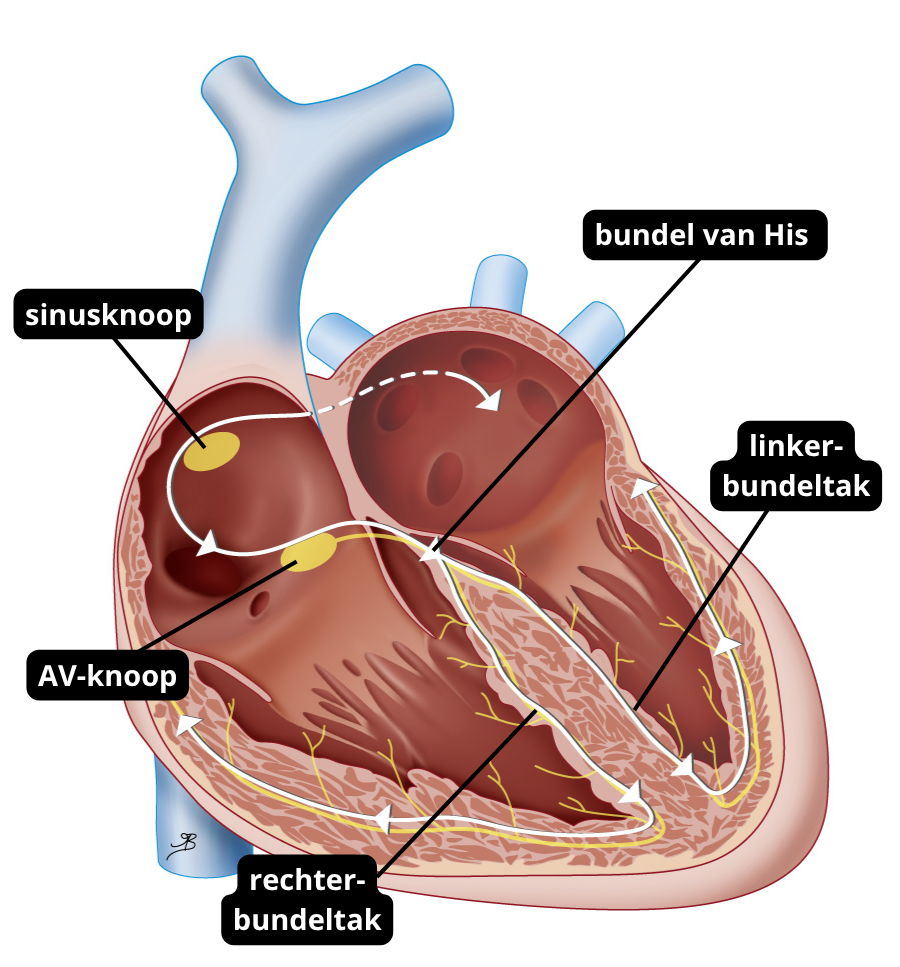Elke elektrische prikkel vertrekt vanuit de sinusknoop, de natuurlijke pacemaker in de rechtervoorkamer van het hart. Dit signaal verplaatst zich verder naar beide voorkamers waardoor deze samentrekken. Hierna bereikt de elektrische prikkel de AV-knoop, een schakelstation tussen de voorkamers en de kamers, waar het signaal kort vertraagd wordt. Zo krijgen de voorkamers voldoende tijd om samen te trekken voordat de kamers aan de beurt zijn. Daarna wordt het signaal via speciale geleidingsbanen, de bundel van His met een rechter- en linkerbundeltak, naar de hartkamers gestuurd. Hierdoor trekken beide hartkamers gecoördineerd samen en pompen ze het bloed efficiënt naar de longen en het lichaam.