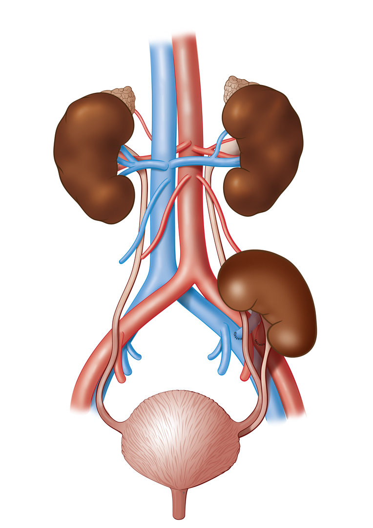 - De plasbuis (ureter) van de donornier wordt op de blaas gehecht.